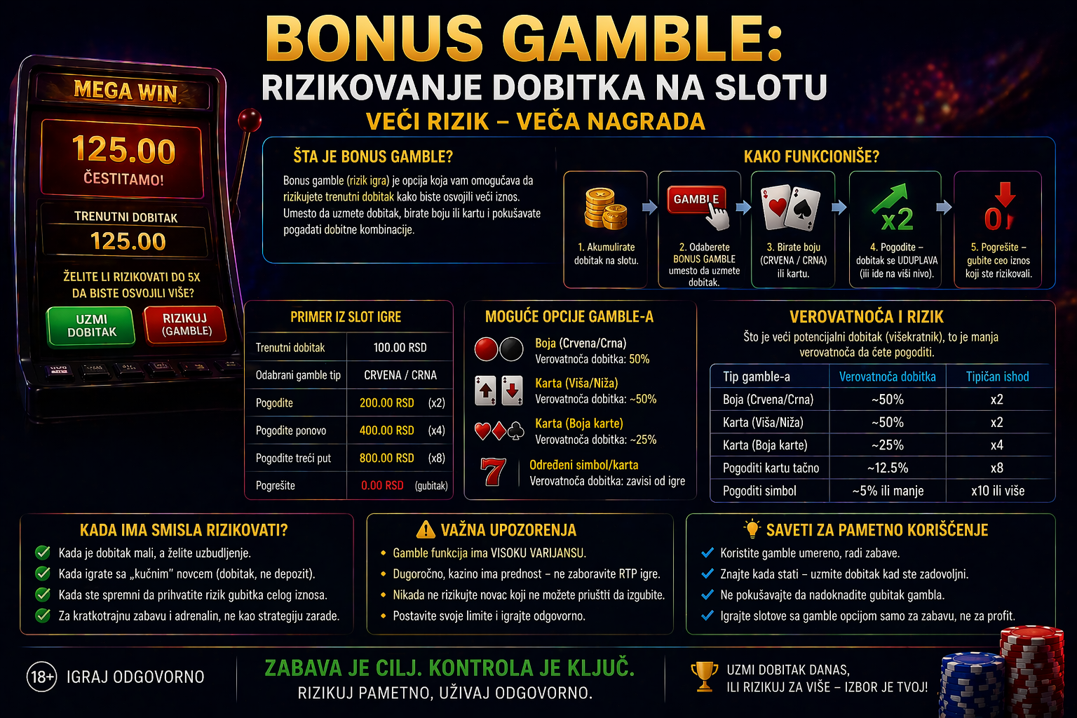 Gamble opcija nije bonus u pravom smislu reči. Ona je dodatna igra sa sopstvenim pravilima i matematikom. U većini slučajeva, kazino i dalje ima prednost.
